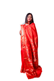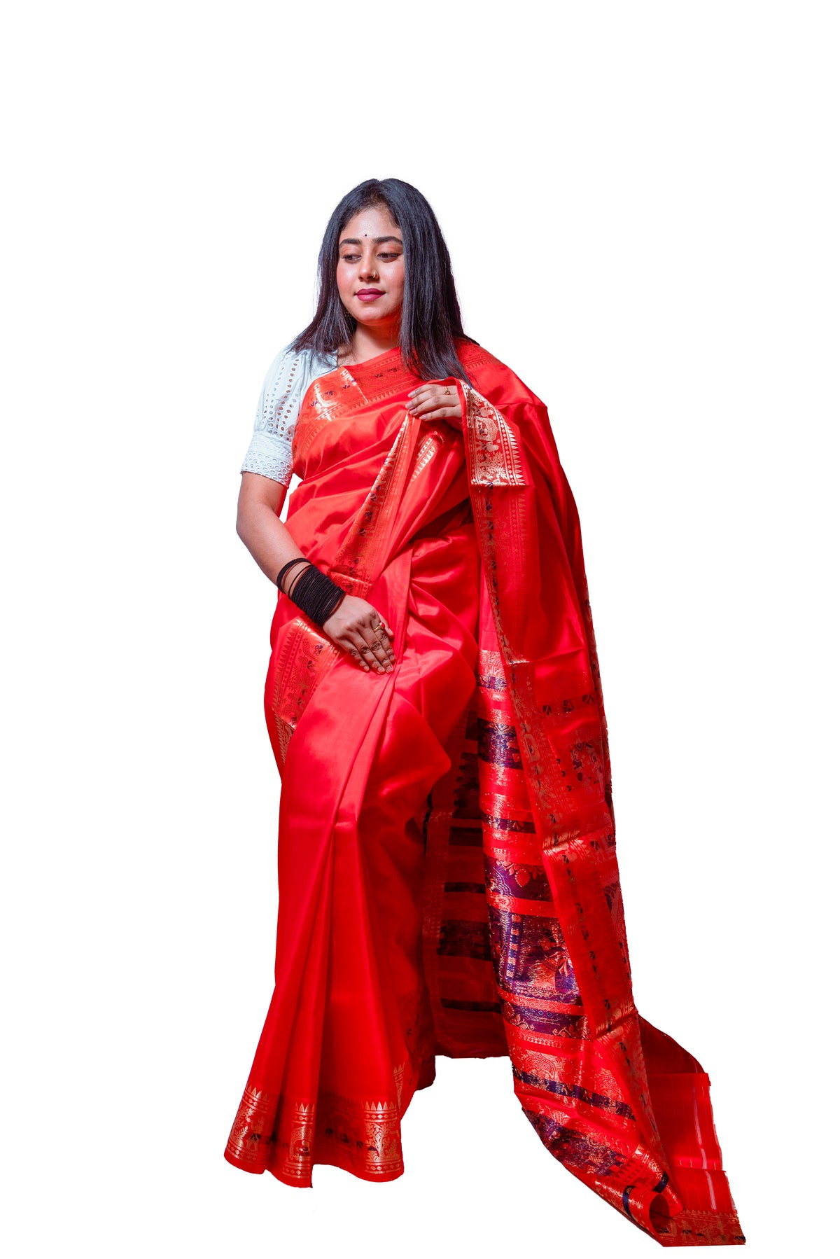 Turn heads with this exquisite Orange Garad Baluchuri silk saree, designed with premium Garad Silk and adorned with intricate golden zari motifs. Perfect for weddings, festive occasions, and celebrations.