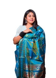 Step into elegance with this royal blue Garad Swarnachuri silk saree, adorned with golden zari work and floral motifs. Ideal for weddings, festive occasions, and cultural celebrations.