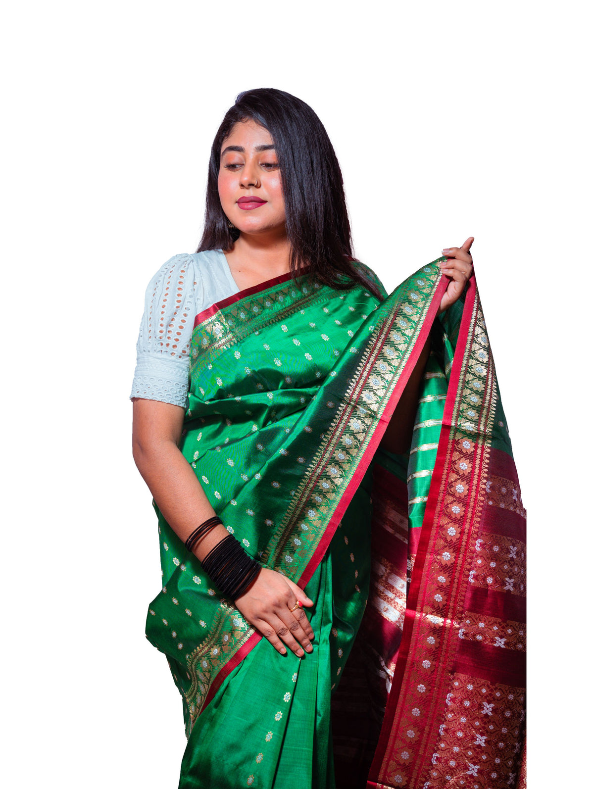 Striking green Garad silk saree with rich maroon zari pallu and golden-silver woven motifs. A graceful blend of heritage and sophistication, perfect for weddings and festive events.